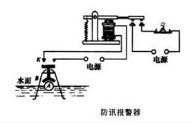 防訊報警器:K是接觸開關(guān),B是一個漏斗形的竹片圓筒,里面有個浮子A,水位上漲超過警戒線時,浮子A上升,使控制電路接通,電磁鐵吸下銜鐵,于是報警器指示燈電路接通,燈亮報警。