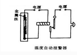 溫度自動報警器:當(dāng)溫度升高到一定值時,水銀溫度計中水銀面上升到金屬絲處,水銀是導(dǎo)體。因此將電磁鐵電路接通,電磁鐵吸引彈簧片,使電鈴電路閉合,電鈴響報警,當(dāng)溫度下降后,水銀面離開金屬絲,電磁鐵電路斷開,彈簧片回原狀,電鈴電路斷開,電鈴不再發(fā)聲。